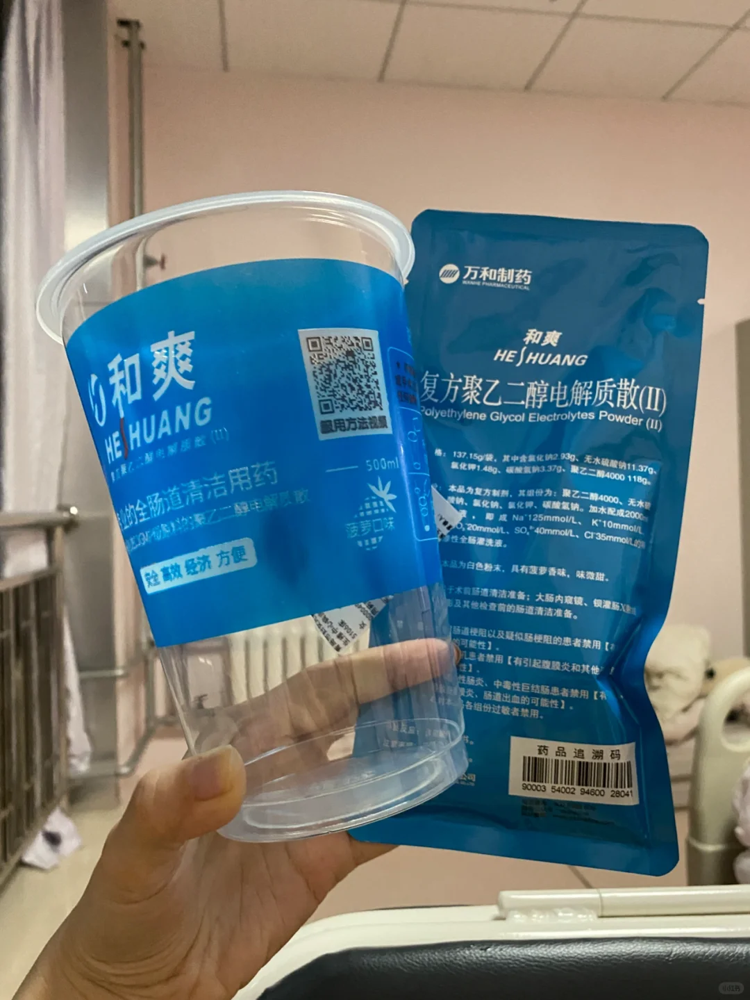 术前一晚,要喝2L聚乙二醇(清肠道的)。这个对我来说太痛苦了,虽然说味道不难喝,但是量多啊?可能是喝的太着急了,中途吐了两次。姐妹们喝的时候可以慢点喝?慢走,应该会好一些。